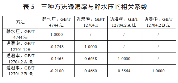 表 1 的測試數(shù)據(jù),對三種透濕率測試指標(biāo)和靜水壓指標(biāo)進(jìn)行相關(guān)系數(shù)分析,具體見表 5。