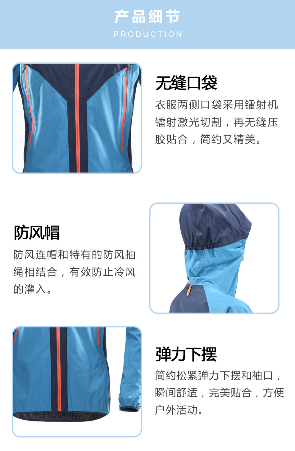 防風帽:防風連帽和特有的防風抽繩相結合,有效防止冷風的灌入。