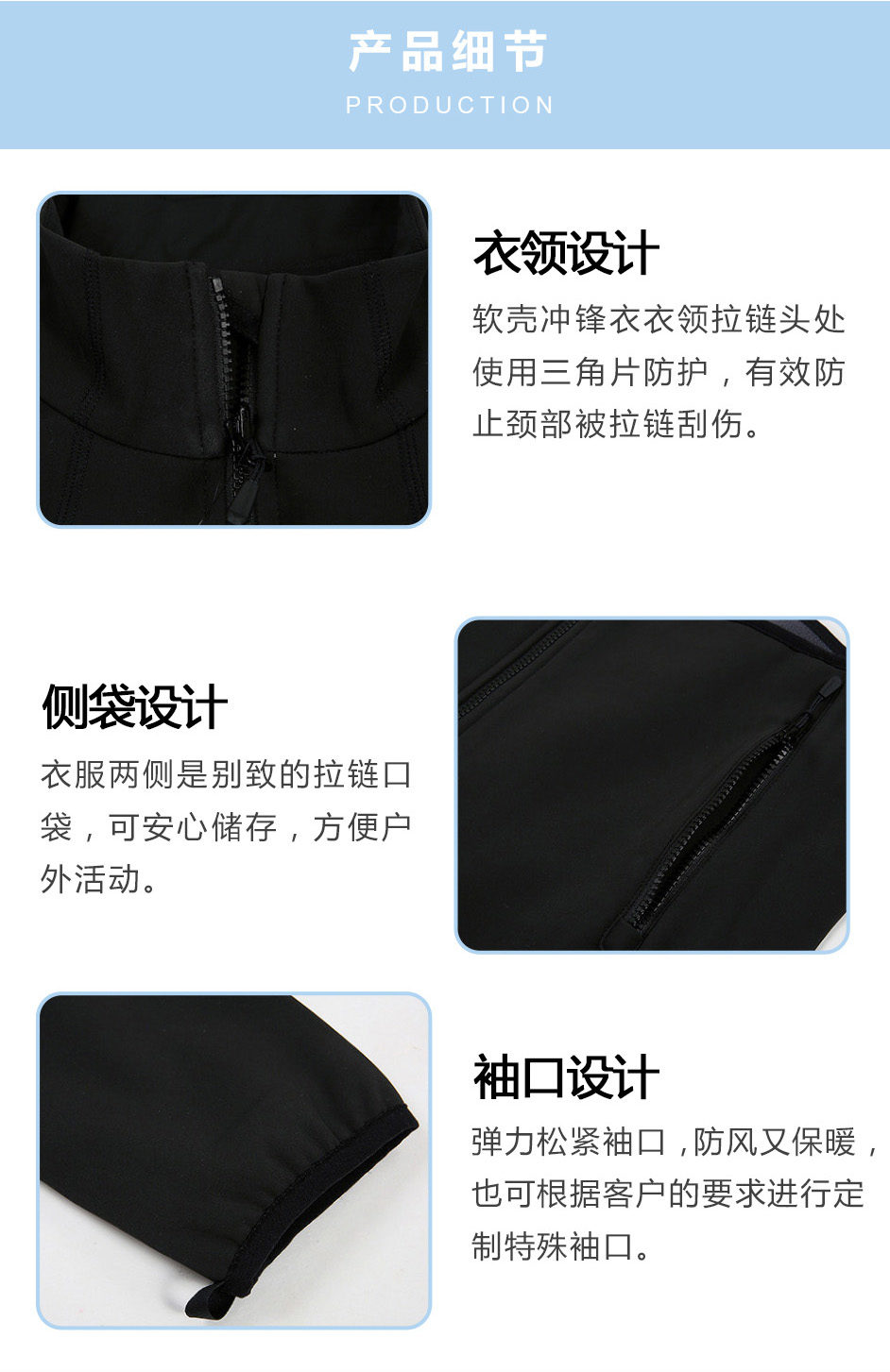 袖口設(shè)計(jì):彈力松緊袖口,防風(fēng)又保暖,也可根據(jù)客戶的要求進(jìn)行軟殼沖鋒衣定制其的特殊袖口。