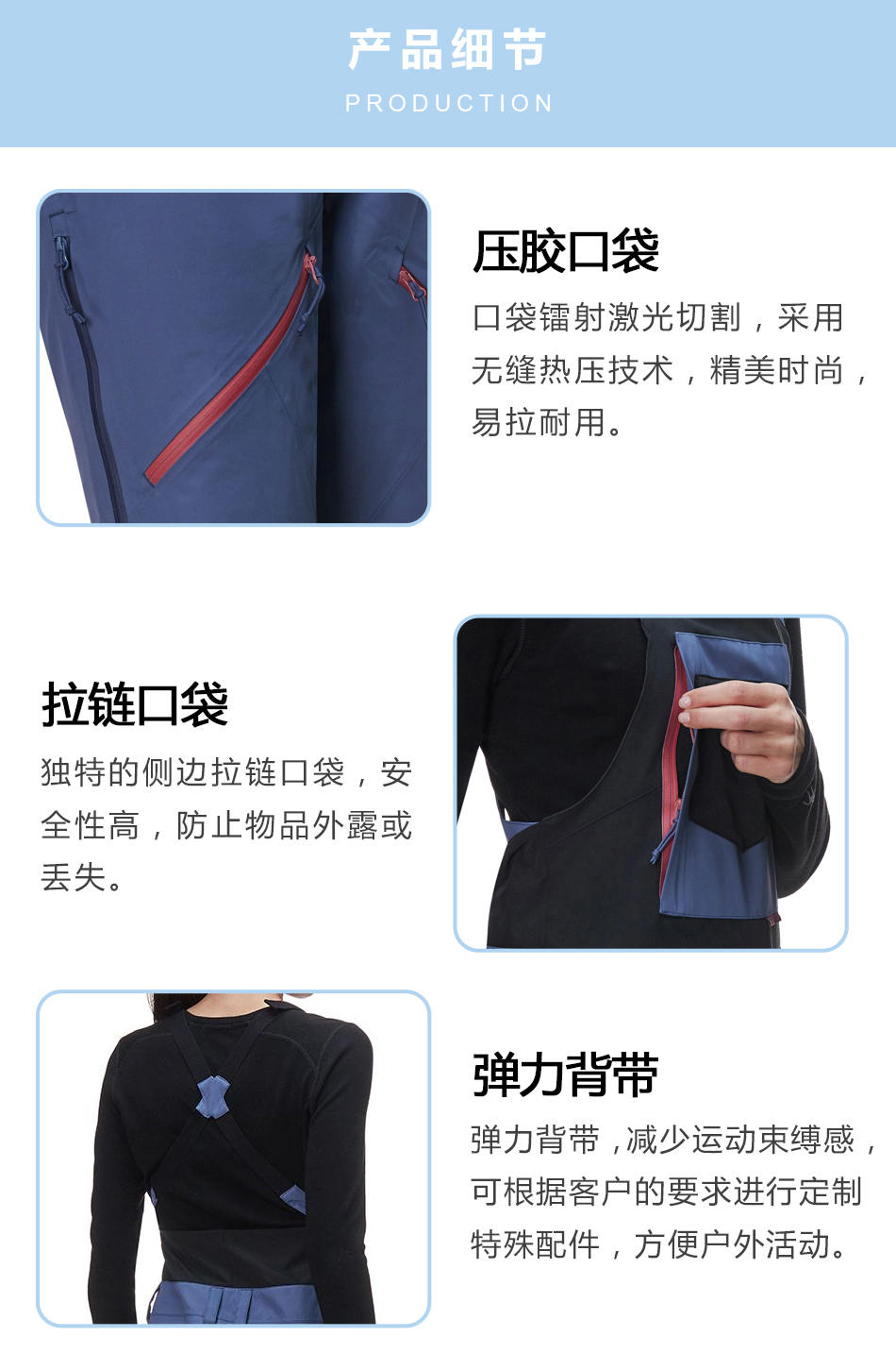 彈力背帶:彈力背帶,減少運(yùn)動(dòng)束縛感,可根據(jù)客戶(hù)的要求進(jìn)行定制特殊配件,方便戶(hù)外活動(dòng)。